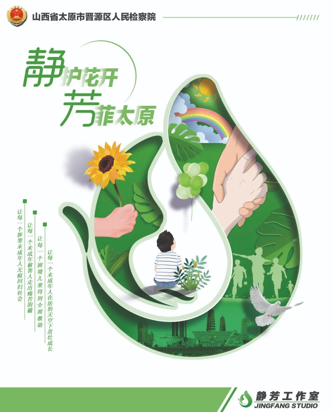 为了更好地为未成年人提供多元综合保护,“静芳工作室”整合45个部门构建了未成年人权益保护合作机制,以“专业工作室+保护同盟军”的模式,建立了“纵向到底、横向到边、不留死角”全覆盖工作体系,为政府各部门、各行业和社会各界自觉加强未成年人保护工作搭建了平台。治已病,不如防未病,事后补救,抵不过事前预防,为此,我们根据真实案例,自编自导自演校园法治情景剧《法,就在我们身边》,通过对未成年人常见犯罪的演绎、剖析,以学生的视角诠释法律,将警示融于情景。我们还精心录制了“两法”宣传公益片《未你而来》及家庭教育促进法公益宣传动漫,还有我们改编拍摄的微电影《静护花开》,在首届全国未检“三微”评选中荣获了优秀奖。 “静芳工作室”不仅是晋源区检察院的未检工作品牌,它也让我们的未检工作像一束光一样,照亮着未成年人的人生,成为未成年人的引航灯。让每一个未成年被害人走出痛苦阴霾,让每一个困境儿童得到全面救助,让每一个未成年人在法治天空下茁壮成长,这是“静芳工作室”的初心和使命,也是我们每一个未检人的职责与担当。
